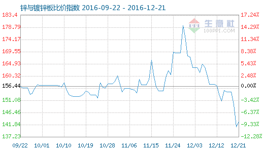 12月21日鋅與鍍鋅板商品比價指數(shù)為142.97,較昨日上升了1.89點(diǎn),較周期內(nèi)更高點(diǎn)179.56點(diǎn)(2016-11-28)下降了20.38%,較2012年06月28日更低點(diǎn)96.53點(diǎn)上漲了48.11%。(注:周期指2012-01-01至今)